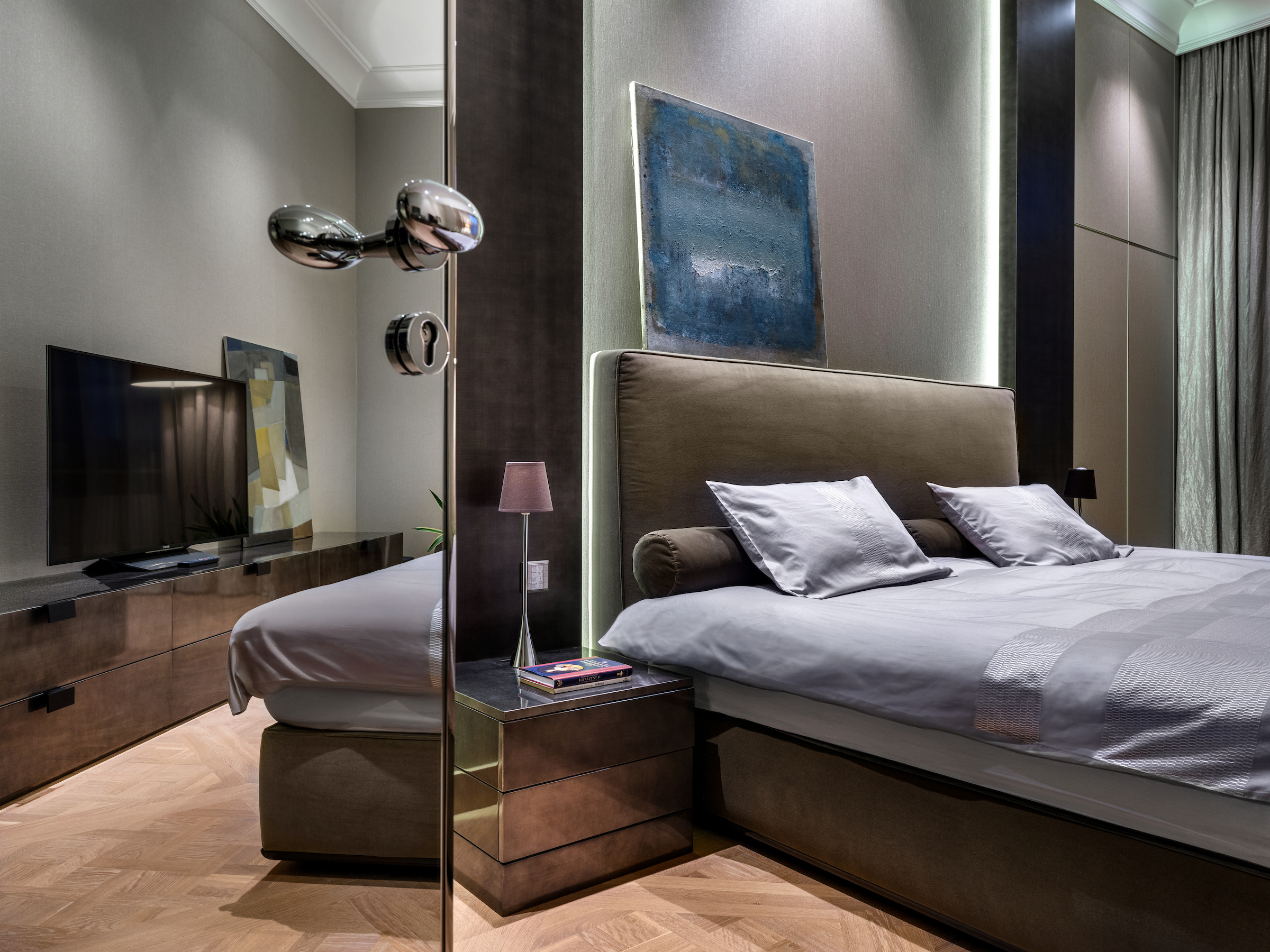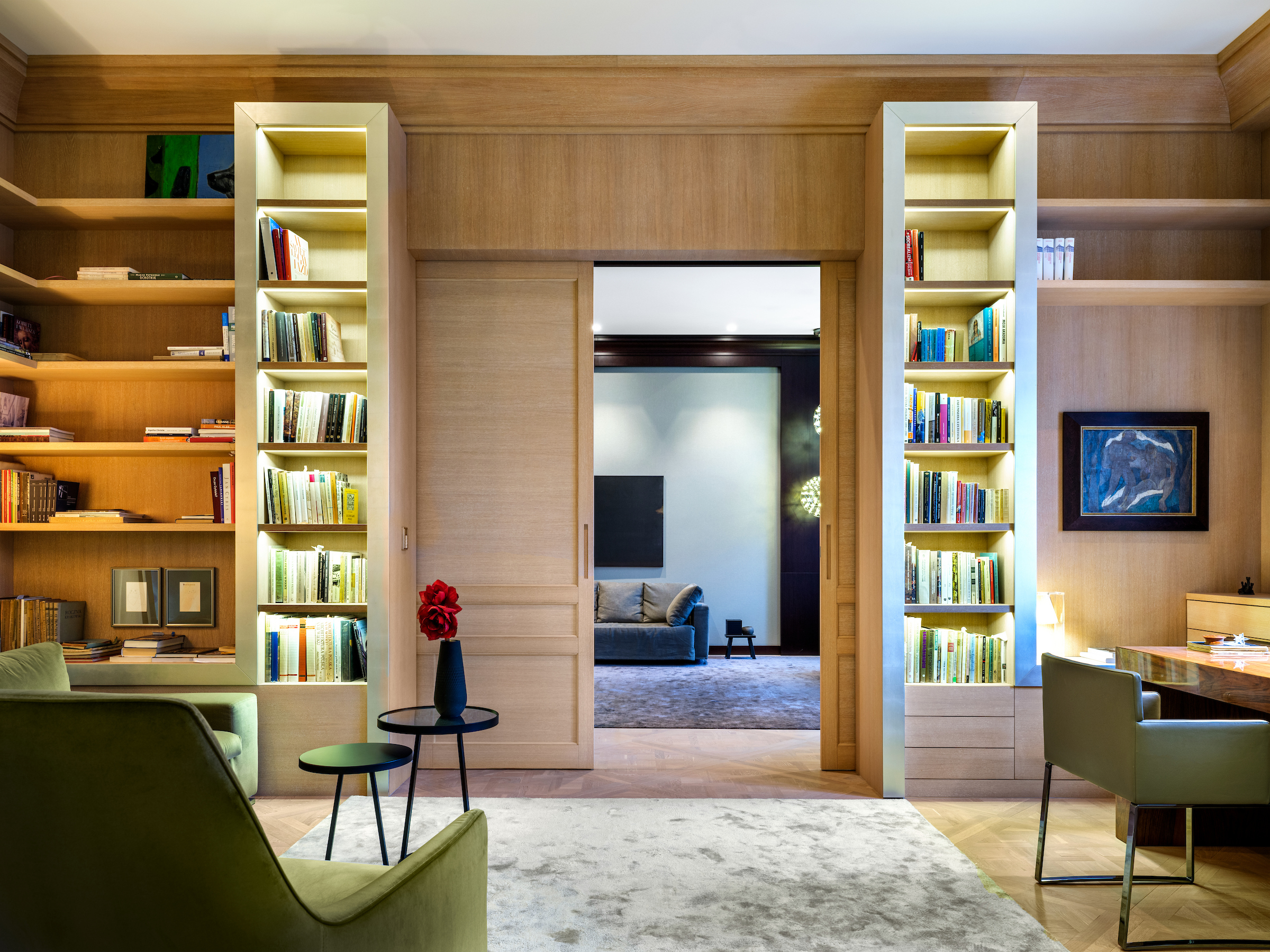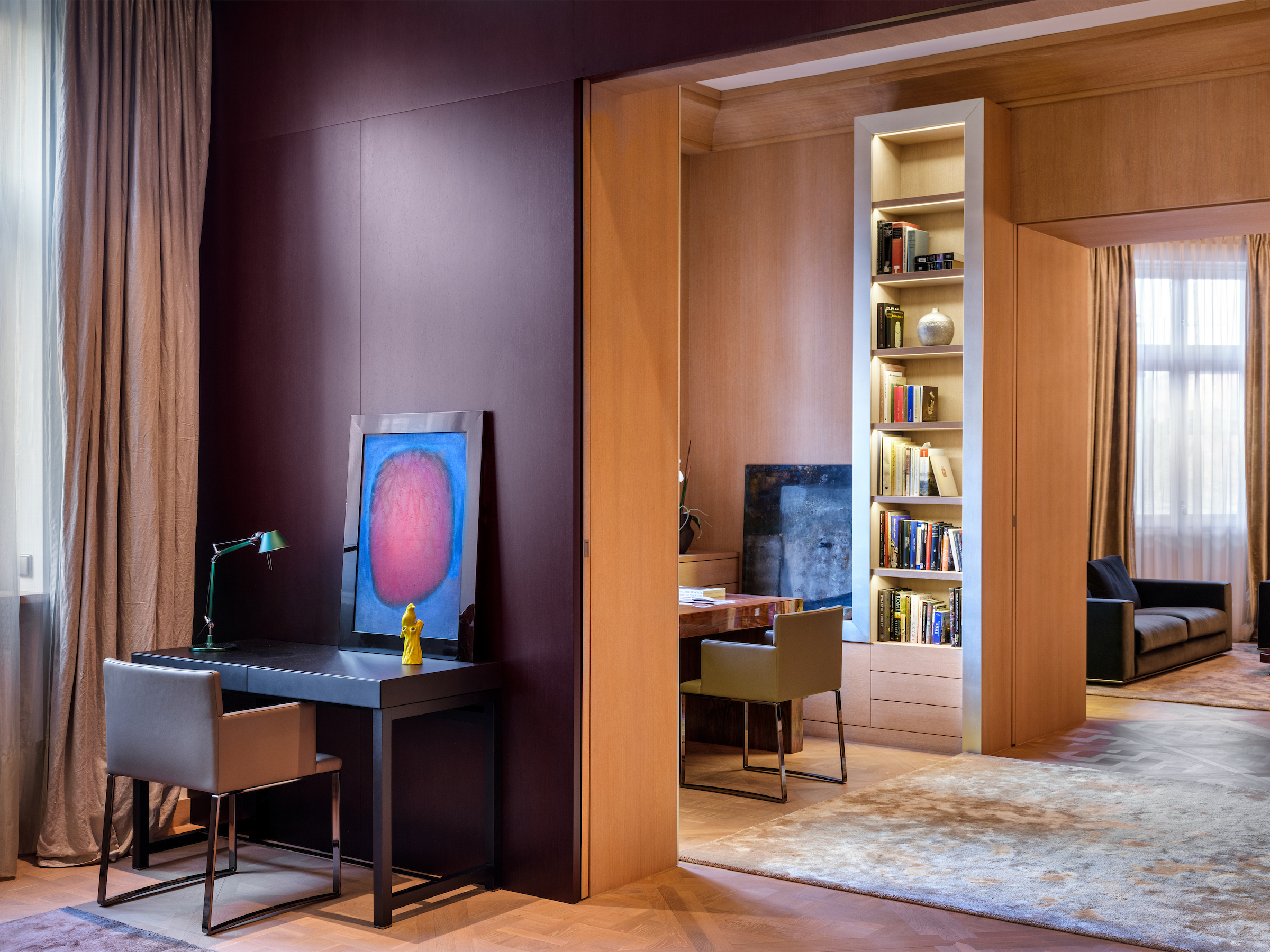 The apartment’s layout has been carefully composed to support long-term livability and privacy. Generous living areas transition seamlessly into more intimate zones, creating a natural rhythm throughout the residence. Architectural details and bespoke built-ins enhance functionality while preserving a sense of order and calm.