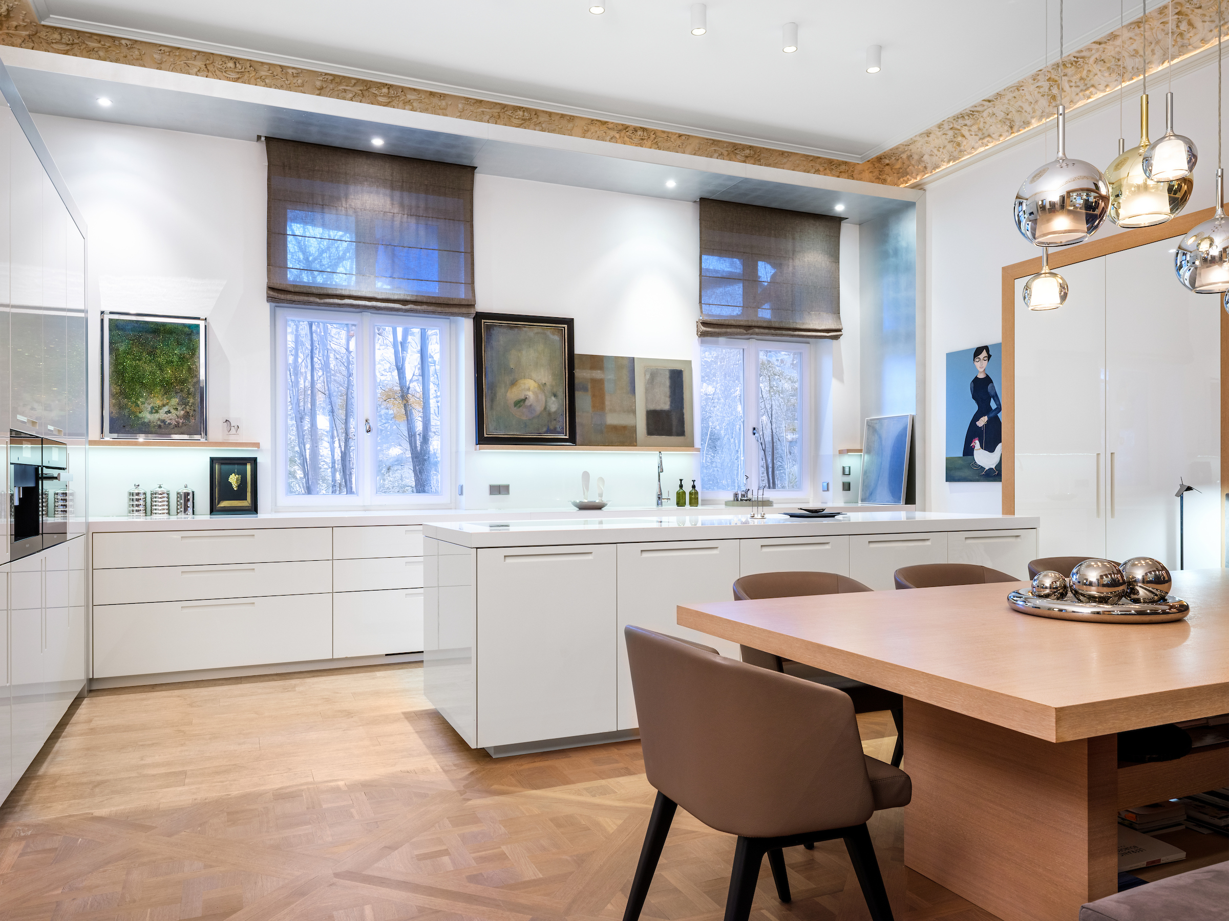 The interior blends classic European elegance with modern comfort, conceived with exceptional sensitivity to proportion, detail, and material quality.The enfilade layout of four interconnected rooms creates architectural harmony, offering both flexibility and privacy. High ceilings with restored original plaster mouldings are complemented by bespoke carpentry, made-to-measure wooden built-ins, refined wall finishes, and curated lighting, creating a timeless, sophisticated aesthetic. Original wooden windows ensure exceptional acoustic comfort while overlooking one of Kraków’s most iconic green spaces — a home for those who value privacy, craftsmanship, and refined living.
